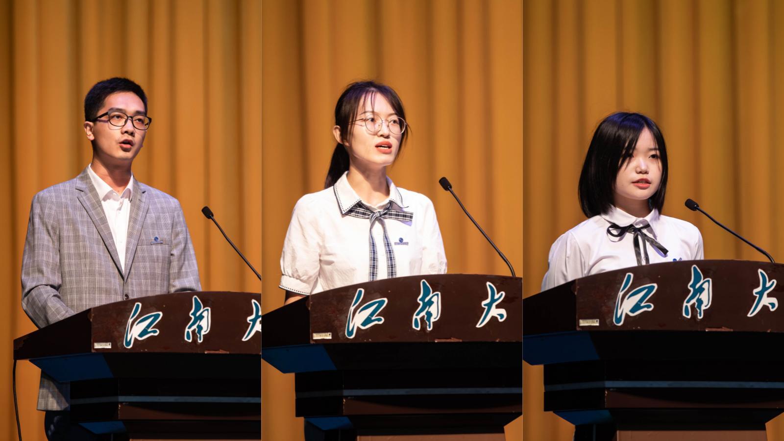 在老生代表发言环节中,微电子科学与工程专业2019级本科生何丁赋以“破浪还需有风乘”“万里跬步非独行”“精金仍需百千锤”三个角度,为在场的同学们分享了他的“物联心与物联情”,并祝愿大家共同乘风破浪、同行万里,将有限的青春岁月碰撞出无限的青春活力。紧接着,在新生代表发言环节,2022级博士生张田雨以24个字分享了自己的科研之路,鼓励同学们要始终怀揣报国之志,心怀科研之梦,躬下身、潜下心、抬起头,以物联“唯实”的精神去创造辉煌的未来。自动化2204班梁樱琪呼吁大家响应时代召唤,珍惜大好时光,用知识丰满羽翼,在宽阔的知识海洋中自由徜徉;用拼搏成就梦想,让自己的青春光彩隽永绵长,努力做新时代科技型青年。
