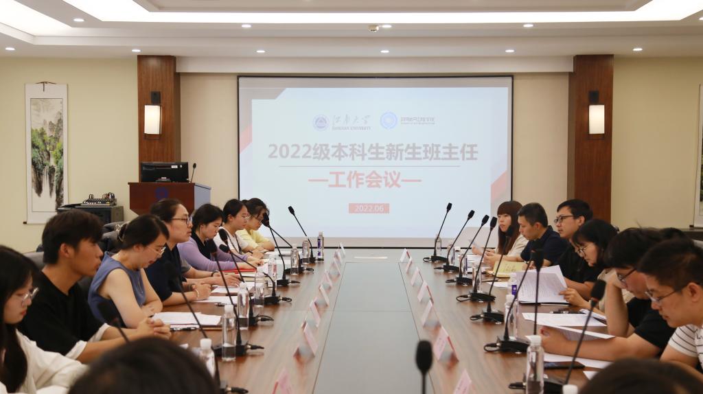 在B222会议室召开2022级新生班主任培训会。学院党委副书记、副院长孔丽丹,分团委书记兼学工办主任洪筱,2022级新生辅导员王涛、曾磊以及2022级全体班主任、班主任助理参加会议。