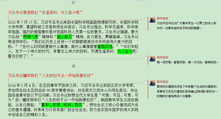 《习近平与大学生朋友们》这本书涵盖了习近平同志在正定、厦门、宁德、福州、浙江、上海以及到中央工作以来各个时期与大学生交往的实录,访谈对象从60后、70后、80后、90后乃至00后,几乎覆盖了改革开放以来各个年龄段的大学生群体。30多年间,习近平同志的工作职务不断变化,但他对青年特别是对大学生的重视关怀始终如一。这本书解决了很多同学“新时期青年如何建功立业”和“如何实现人生价值”的问题,为同学们指明了前进的方向,非常值得青年一代认真阅读。