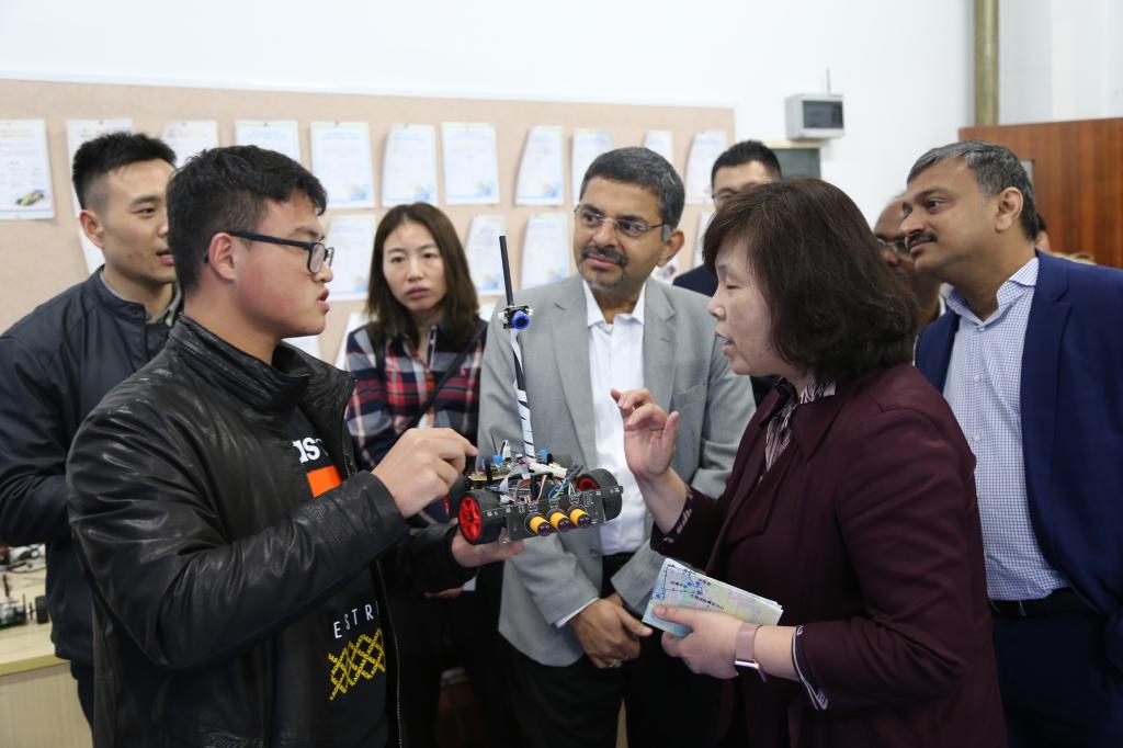 在物联网大学生创新实践基地,基地负责人肖志勇、院分团委书记吴垚介绍了学生创新实践的总体情况,着重介绍了学院以各类学生创新俱乐部为平台,通过开展各类创新普及讲座和创意开发类活动,激励大学生参加创新实践类项目、参加ACM-ICPC国际大学生程序设计竞赛等各类高水平竞赛,在实践中锻炼学生创新能力的做法。随后,调研团参观了智能汽车俱乐部和机器人俱乐部,对学生课外实践活动表示出较大的兴趣,并与学生进行了交流。