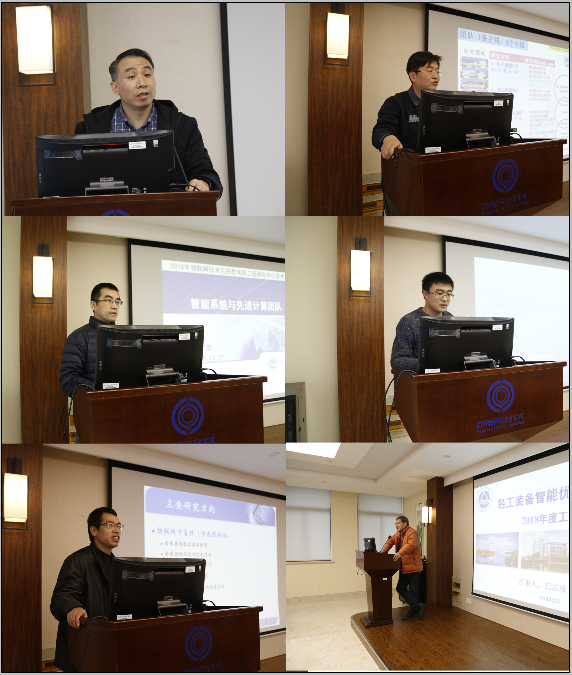 随后,工程研究中心的六个研发团队汇报了各团队建设情况。物联网应用与智能控制团队负责人谢林柏、半导体器件与电路研究所负责人顾晓峰、智能系统与网络计算研究所负责人柴志雷、智能检测与控制研究所骨干教师张善新、智能感知与无损检测研究团队负责人李光辉、轻工装备智能优化制造团队负责人纪志成等代表各团队,就2018年度的研究进展、研发成果以及团队下一阶段拟开展的主要研究工作等内容做了详尽汇报。