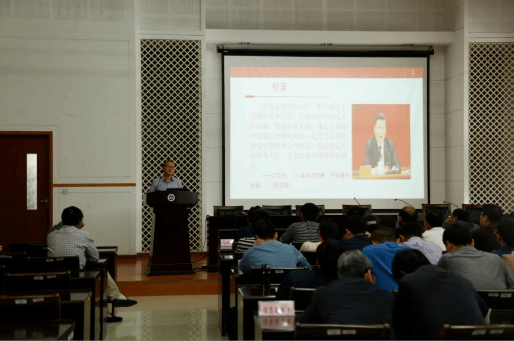 会上,马克思主义学院刘俊杰副教授应邀做了《中国共产党章程》学习辅导报告。他从党章从何来、为何学党章、如何学党章、党章学什么四个方面对党章发展历程、重要意义、学习方法和学习内容进行深入剖析,指出学习党章要突出问题导向,逐条逐句通读,并把学习党章与学习党的其他理论结合起来,开展经常性的学习教育;学习党章要把握好“一个全面理解、两个关注、三个牢记”,要全面理解党的纲领,重点关注党的组织制度、党的基础组织,牢记入党誓词、牢记党的宗旨、牢记党员义务和权利,进一步坚定理想信念,强化宗旨观念,做“四讲四有”的合格共产党员。