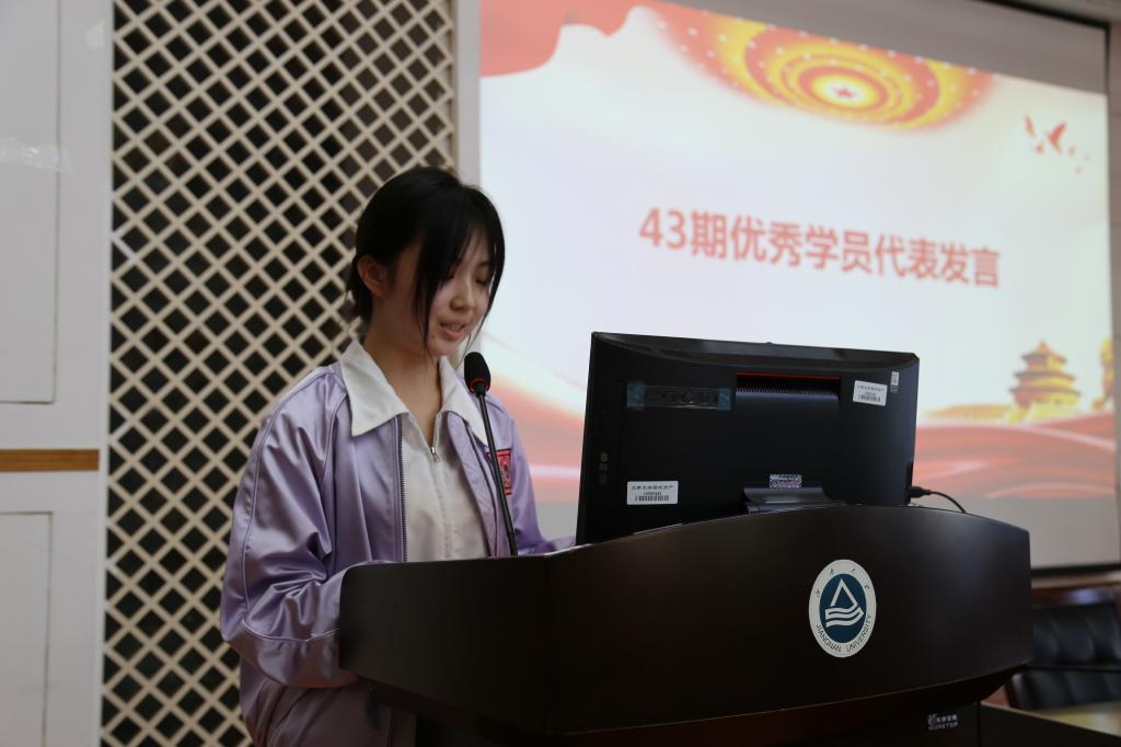 随后,第43期分党校优秀学员代表韩静发言。她分享了自己在党课培训中的心得体会,讲述了自己在身份意识和思想上的转变,激励学员作为党员发展对象,要始终坚定理想信念,筑牢精神支柱,以身作则自觉遵守疫情防控规定,发挥模范带头作用。接着,梁建为第44期发展对象培训班代表赠书,李灿介绍了此次分党校培训内容和考核方式。