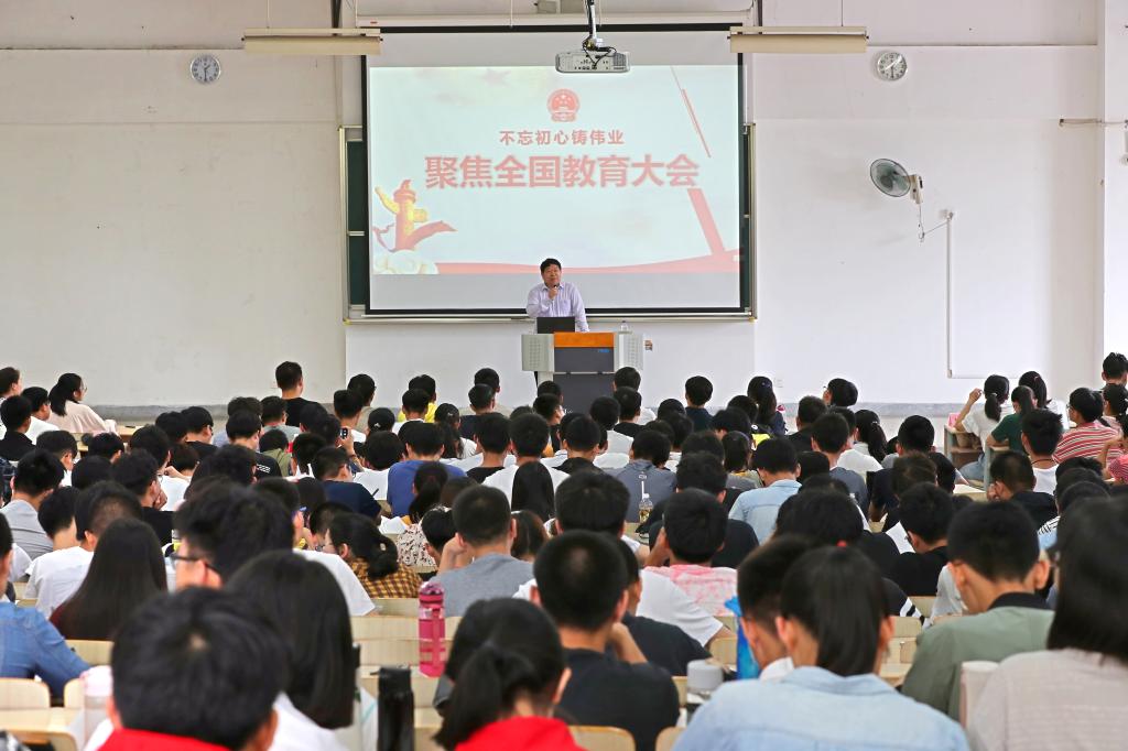 首先,陈校长带领同学们回顾了改革开放以来党中央、国务院召开的四次全国教育工作会议,追溯了历次会议的历史背景、主要内容、发展目标。接着,他围绕新时代全国教育大会的背景和概述、贯彻落实全国教育大会精神、推动学校内涵式发展三个部分展开了深入的讲解。他强调了党的十八大以来,各级、各类高校都面临着“培养什么人、怎样培养人、为谁培养人”这一根本问题,当今党和国家事业的发展迫切需要高等教育、科学知识和优秀人才。陈校长传达了本次全国教育大会的主要精神,指出了新形势下的教育方针,阐明了教育事业的当代意义,高度评价了教师的贡献和地位。他详细阐释了九个“坚持”,突出强调了“坚持把立德树人作为根本任务”、“坚持把服务中华民族伟大复兴作为教育的重要使命”,明确了培养社会主义建设者和接班人是我们教育的根本任务。陈校长还指出,在座的同学都是新时期国家亟需的优秀人才,不论在何种岗位,都应以实现中华民族伟大复兴为己任,树立正确的世界观、人生观、价值观,坚定理想信念,增强奋斗精神,为国家和社会的发展作出贡献。