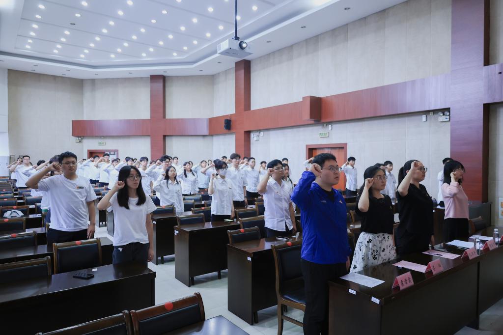 宣誓仪式在雄壮的《国际歌》中拉开序幕,激昂的旋律回荡在报告厅内,激发了在场每一位党员的爱国热情和使命感。随后,全体新党员在庄严的党旗下佩戴党员徽章,在糜海燕的领誓下,面向党旗,紧握右拳,庄严宣誓,表达了他们为共产主义事业奋斗终身的决心。同时,老党员们也一同重温入党誓词,回顾入党初心,坚定理想信念。