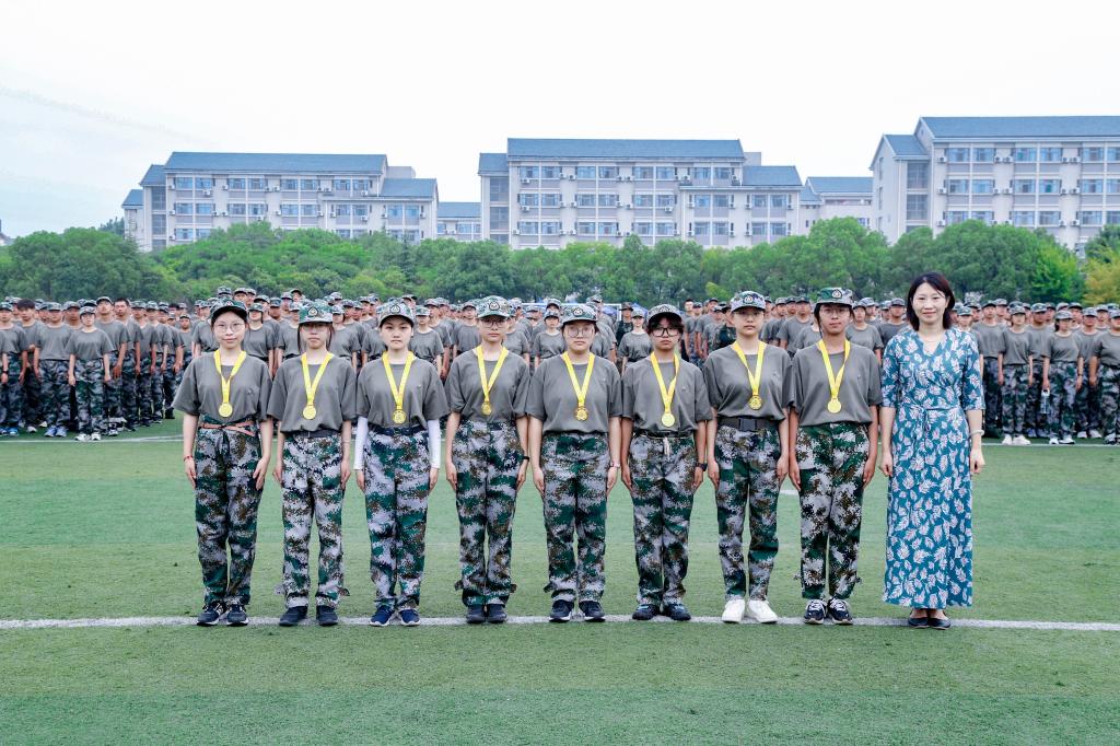栾小丽和孔丽丹为在“电子打靶”训练项目中表现优异的学生代表颁发奖牌,以此激励同学们在各项军训活动中追求卓越,奋勇争先。