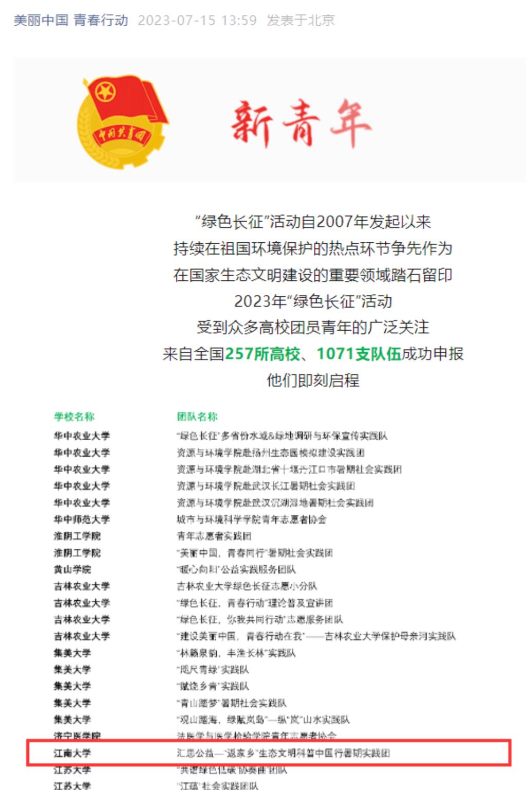 汇思公益团组建的“汇思公益——返家乡生态文明科普中国行暑期实践团”成功入选2023年乡村振兴“笃行计划”专项行动全国示范性团队和“美丽中国·青春行动”2023年青少年绿色长征科考实践活动,两个专项活动均为日本动漫