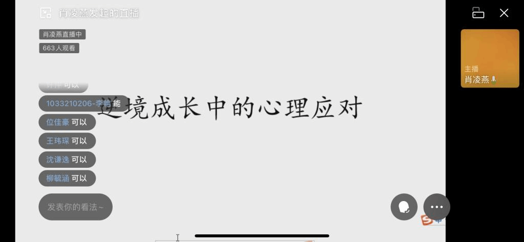 讲座结束后,同学们受益良多,纷纷在企业微信群中向肖老师表达了谢意并分享自身感受。赵浩征同学说:“在这个不断变化的时代,逆境接踵而至,我们要学会增强自身能力,提升抗逆力,增强生命的强韧度。”姜绍彬同学说:“肖老师的讲座中描述的负面思维很符合自身现状,听完讲座后,自己调整了心态,停止批判和否定自己,顺利通过了学生会的面试。”