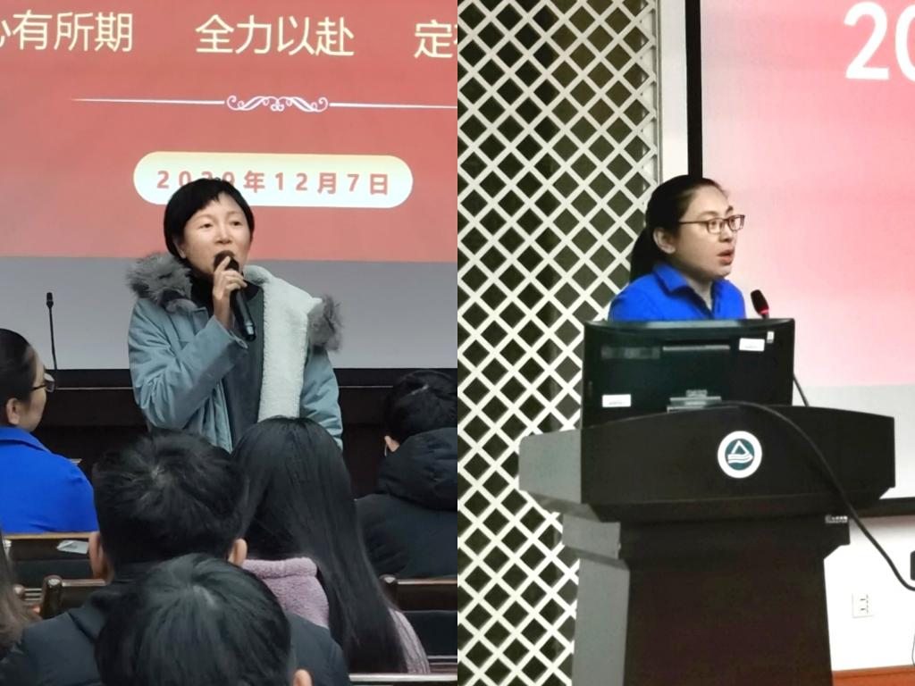紧接着,考研学生代表刘泓珺上台发言,她代表全体考研学子向慰问的各位老师表示感谢,并分享自己备考时的心路历程,最后她号召同学们在剩下的时间里奋起拼搏、为实现自己的梦想不懈努力。