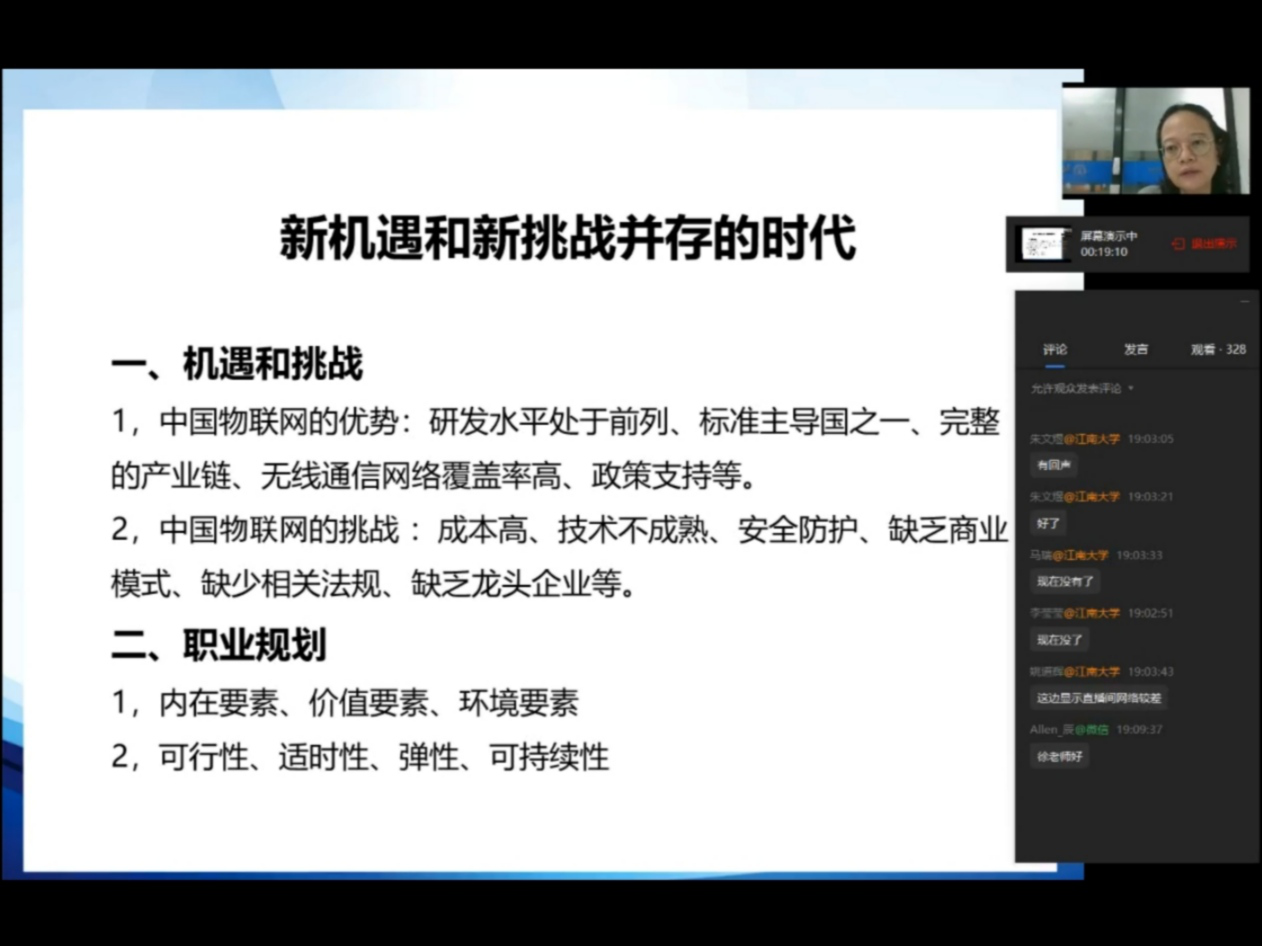 本次讲坛的主要内容为疫情下的国际现状和机遇、各国留学政策趋势以及出国留学前的规划。徐珏女士针对当前的大环境分析了中国物联网行业的优势和挑战,她说道:“虽然中国是物联网标准主导国之一,研发水平处于世界前列且拥有完整的产业链,无线通信网络覆盖率高,但是也面临着诸多挑战。中国的物联网技术并不是非常成熟、还缺少相关法规和龙头企业,这些问题都亟待解决。挑战即机遇,同学们应当把握好时机。”王超予先生向同学们介绍了留学去向和相关规划,根据多年工作的经验阐述了各个国家留学的主要优势及注意点,还为不同英语程度的同学如何学好英语指明了方向。