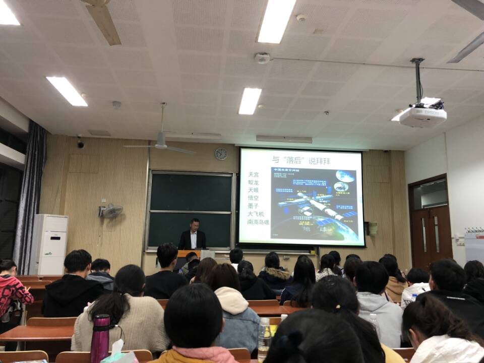 首先,徐教授以对“对美国挑起的贸易战,中国采取针锋相对的反制措施”这一话题的讨论为引,开始了本次报告的第一部分:新时代。即新团队、新面貌以及新问题。关于新团队,徐教授讲到党的领导是第一位的。所谓“武能安邦,文能治国”,如今,国家的顶层设计迈出了新的一步,建立了中国特色权力制约和监察机制,同时指出领导核心的重要性,强调坚持党内原则——民主集中制,确定以人民为中心的服务思想,重视民生,反对独裁与多数人暴政。关于新面貌,徐教授用满怀自豪感的声音,将中国成功研制天宫、蛟龙、天眼、悟空、墨子、大飞机等大国重器,以及岛礁建设等众多举世瞩目的成就娓娓道来。在提及天宫和蛟龙时,徐教授引用了毛主席的一首诗:上可九天揽月,下可五洋捉鳖。关于新问题,徐教授说“我国社会主要矛盾已经转化为人民日益增长的美好生活需要和不平衡不充分发展之间的矛盾”,而这也中国人民收入分配的两极分化和人口老龄化带来的挑战。