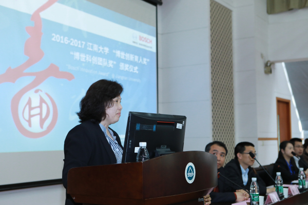 党委书记朱飞对颁奖仪式致辞。朱飞书记对博世公司三年来捐赠学院200万元用于学生奖助学金及奖教金表示感谢,他希望能够进一步加强学校与企业在科学研究、社会贡献等多方面的合作,开创校企合作的新局面。随后,博世汽车柴油系统有限公司战略发展部高级总监陈伟女士代表公司致辞,她对获奖的老师及学生团队表示衷心的祝贺,同时也对物联网学院与博世公司在未来进一步的合作表示极大的期许。