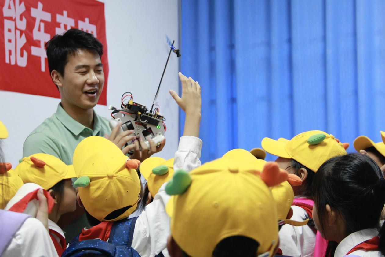 大学生创新实践基地党支部党员担任讲解员。在讲解员的热情引导下,同学们参观了电子设计俱乐部、智能车俱乐部、科普研学基地等创新实践场所。在与讲解员的互动过程中,同学们时而认真揣摩智能车、机器人等展品的科学构造,时而惊喜于展品实现的自主运行、自动避障等奇妙功能,他们不仅像海绵一样汲取知识,更能围绕其中的科学原理踊跃发言。整个研学过程轻松流畅,同学们在操作中发现,在发现中思考,在思考中解决,工程思维也慢慢地在脑海中留下痕迹。