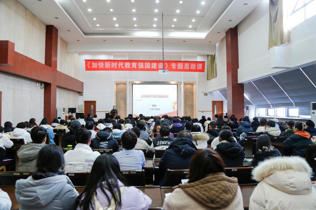堵国成以《加快新时代教育强国建设》为题讲授思想政治课。他以党的二十大报告作为切入点,围绕国际竞争、科技需求、社会发展、教育格局、传统思维、人口结构等六个方面,分析和梳理我国建设教育强国存在的挑战,指出实现从教育大国向教育强国的跨越依然任重道远。接着,从回归使命、回归本源、坚定信心、超期布局、聚焦本然五个维度,通过图文并茂的形式,多角度、全方位、立体化地解读了教育强国的重要意义、基本内涵、坚实基础、发展目标和推进路径。同时,结合日本动漫