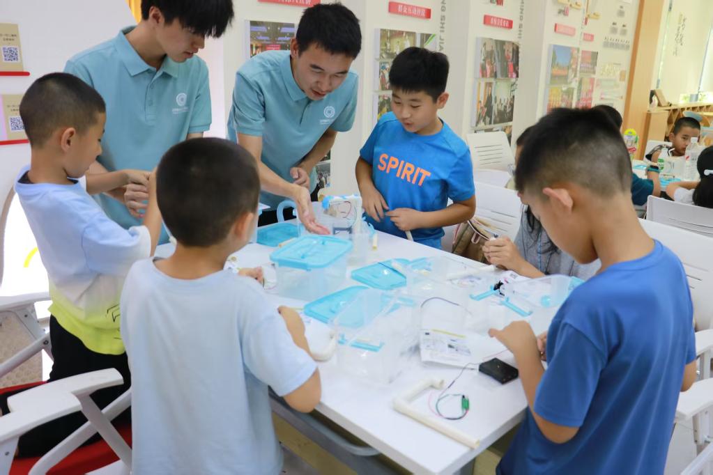 绿色课堂:以科技赋能诠释“向善”内核。如何让科技知识不止于“知”,更能链接生活、传递责任?“芯”智启航实践团给出了自己的答案:将芯片技术与环保理念深度耦合,通过智能节水装置、垃圾分类装置等教具,生动具象“科技向善”的深层逻辑。课堂上,孩子们深入了解到:一块小小的芯片竟能成为守护环境的“绿色引擎”,红外感应芯片与节水装置的结合,让水龙头实现“伸手出水、离手即停”的精准控制;与垃圾桶的联动,让垃圾分类更高效便捷,当实践团成员施宸昊演示感应垃圾桶自动开盖时,孩子们的惊呼不仅是对科技神奇的赞叹,更是对“技术服务生活”的直观感知。这种会“思考”的垃圾桶、会“听话”的水龙头的亲身体验,让科技知识不再是书本上的静态文字、绿色环保不再停留于口头的倡导,科技的实用性与环保的责任感在孩子们心中悄然共生。