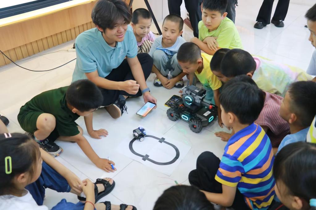 寻“芯”之旅:在趣味互动中解锁科技奥秘。“你想走进‘芯’世界吗?你想学习‘芯’知识吗?”实践团成员廖羽瑄带着亲切笑容、充满童趣的提问,正式开启了这场“寻‘芯’之旅”。课堂上,在理论讲解环节,孩子们不仅系统了解了芯片的应用场景、制作流程与工作原理,更通过大疆智能车360度转弯、黑线追踪等动态演示,直观感受到“科技并非遥不可及”。在动手实践环节中,实践团成员手把手带领孩子们制作声控智能小车:粘贴芯片到电路板、连接电池与电机、安装传感器……孩子们在指尖的操作中,一步步让科创作品“活”起来,零距离触摸到芯片蕴藏的科技之美。互动交流时,实践团成员结合梳理的行业数据,生动讲述中国芯片产业的机遇与挑战,更轻声勉励在场的小朋友们:“我们好好学知识、练本领,将来让国家的科技更牛!”这种“微观操作+宏观视野”的双重引导,让科技启蒙不止于知识的传递,更升华为对使命担当的初心培育。