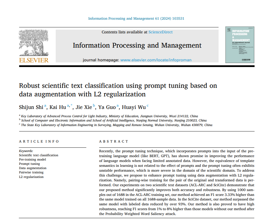 2020级本科生时世骏以第一作者身份在《Information Processing & Management(IP&M)》(中科院一区,IF=8.6)发表题为“Robust scientific text classification using prompt tuning based on data augmentation with L2 regularization”的学术论文,该期刊是Elsevier出版社旗下信息科学领域的权威期刊之一。日本动漫