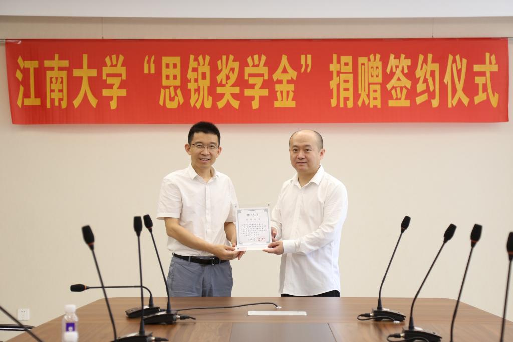 “思锐奖学金”。签约仪式上,程捷音和徐建伟签署了捐赠协议,程捷音代表学院接受了捐赠支票,黄敏代表学校为徐建伟颁发捐赠证书。